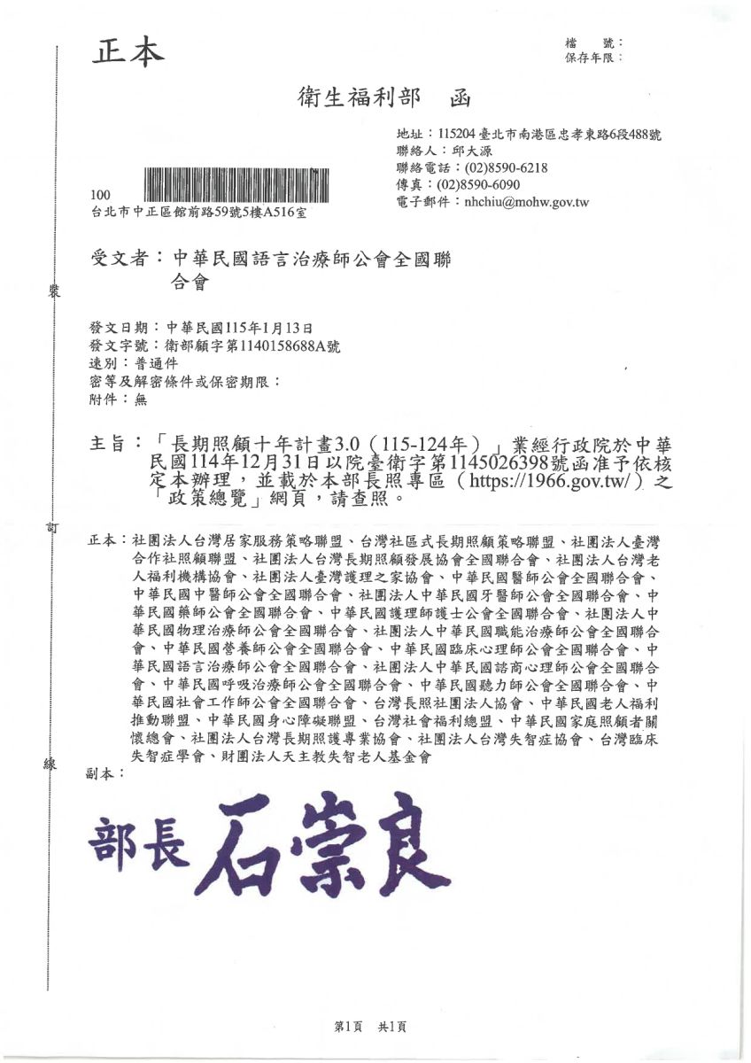 轉知衛福部書函,長期照顧十年計畫3.0 (115-124年)核定本